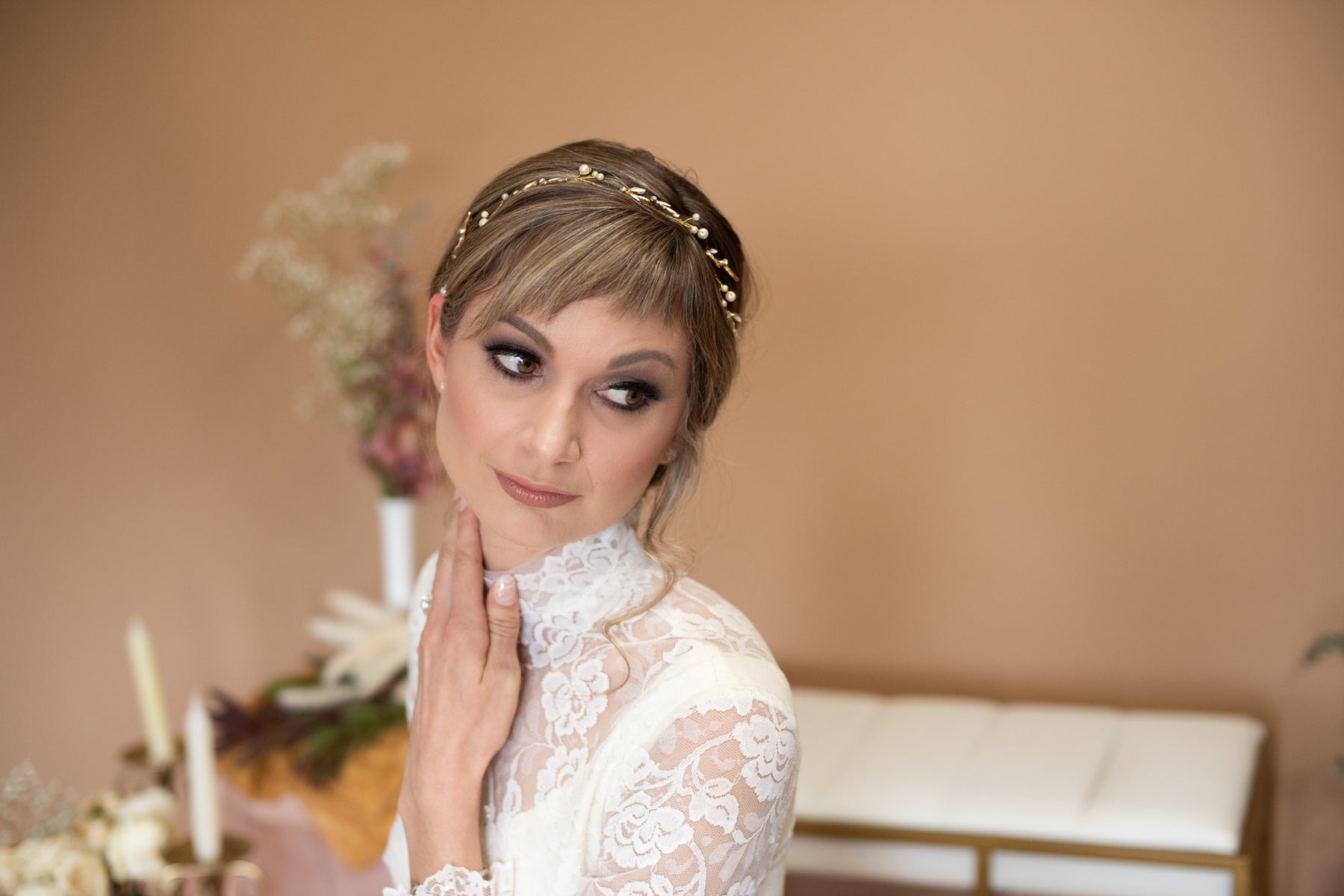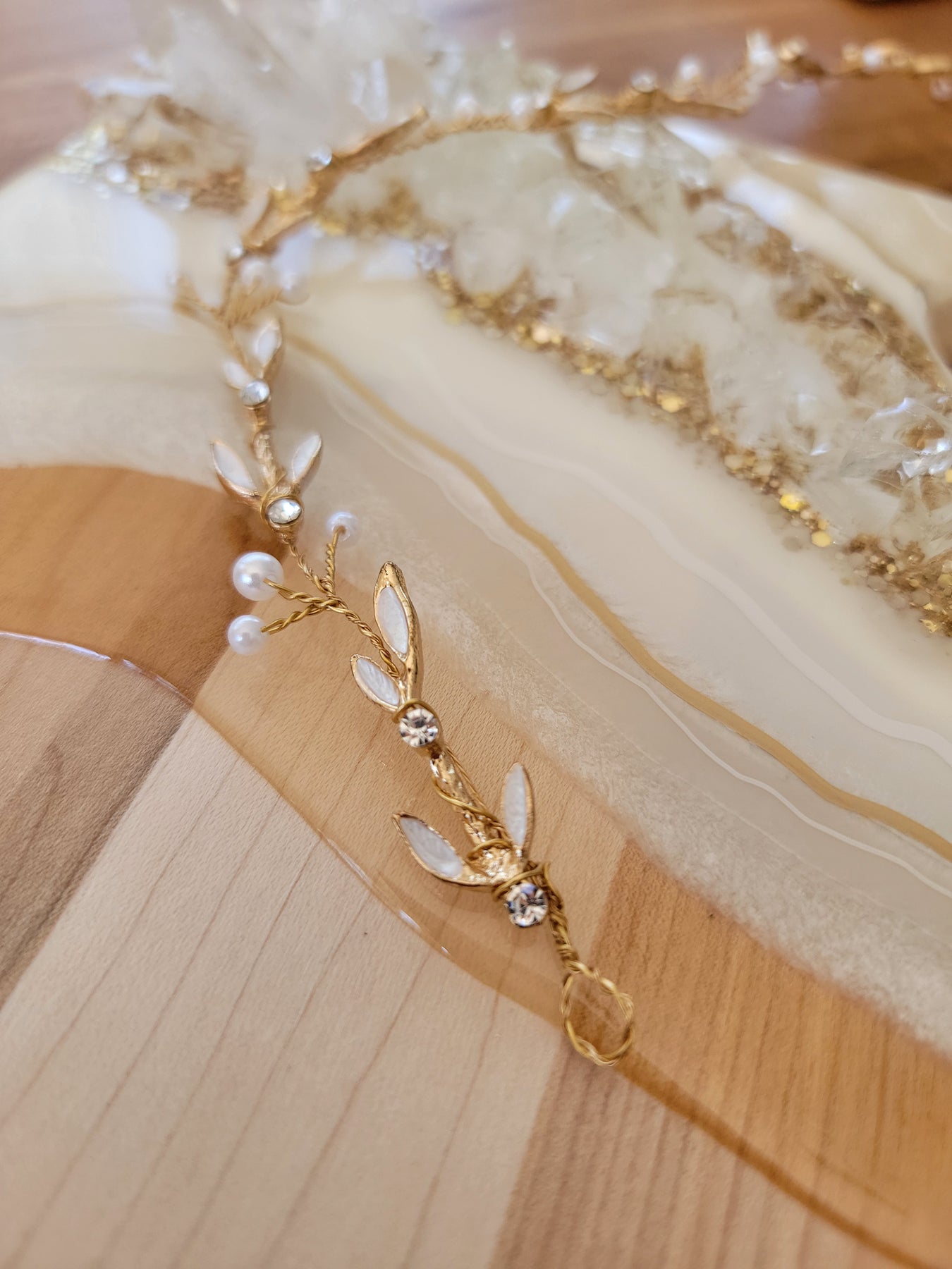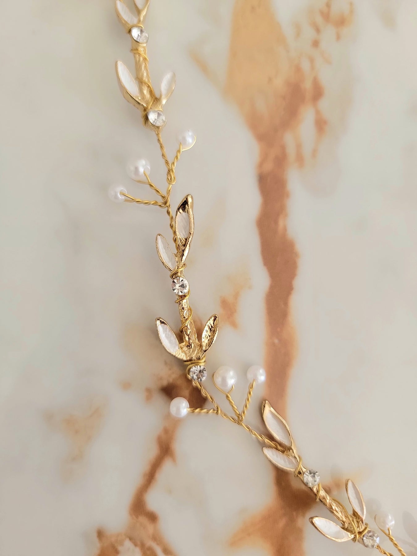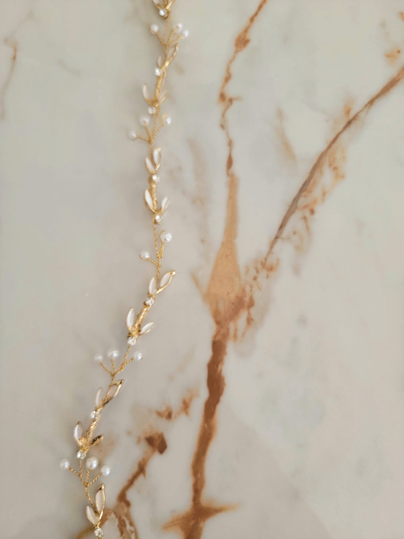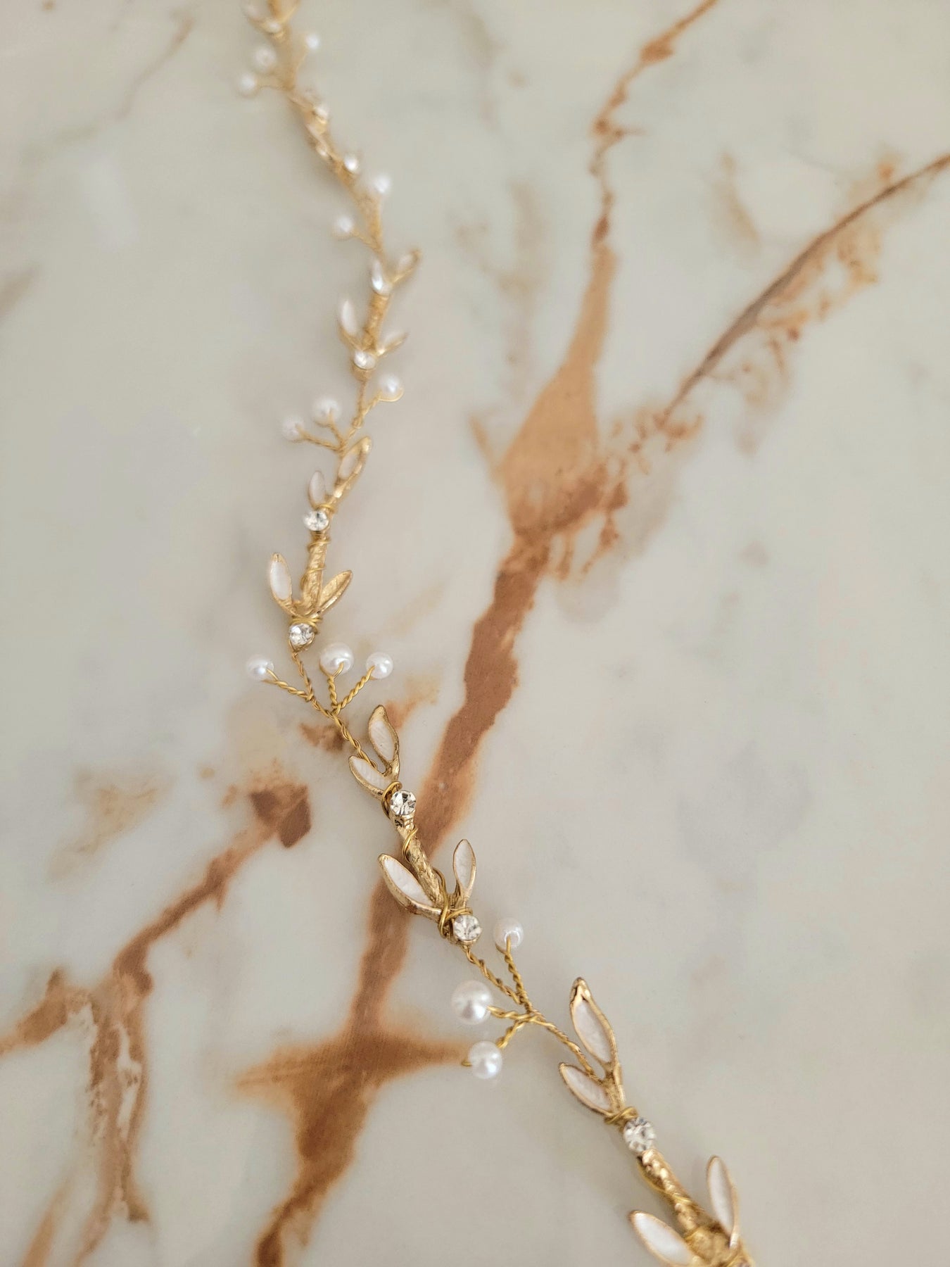 This dainty GABRIELLA hair vine is a popular addition to our 2021 collection. Its subtle and beautiful design make it the perfect accessory for a whimsy wedding! Choos your design and Order as a tie back headband Or as a halo!
