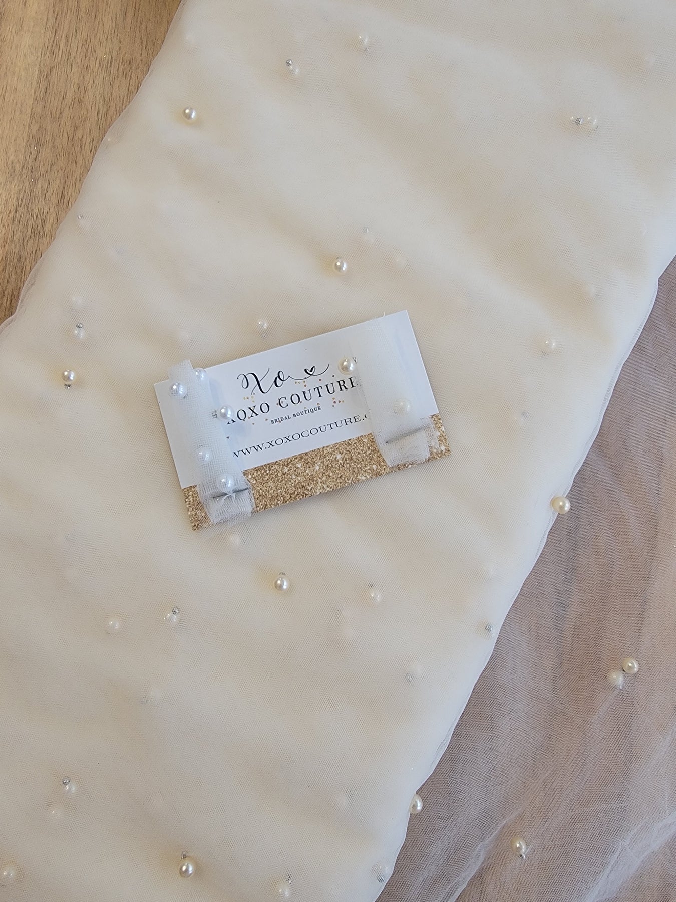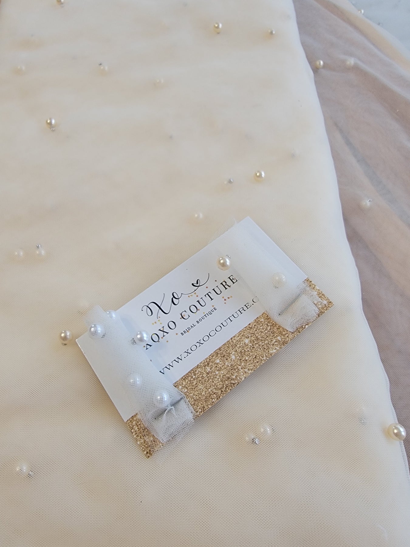 Introducing the NEW ESTELLE Pearl Veil — a stunning blend of classic elegance and modern flair. This exquisite veil features an array of pearls in various sizes, beautifully incorporated throughout its design. It has a rounded bottom and is gathered at the top, hand-sewn onto a 3-inch metal hair comb. The veil pairs perfectly with many of the new dress styles for the upcoming season. Romantic and chic, it is an ideal choice for any bride.