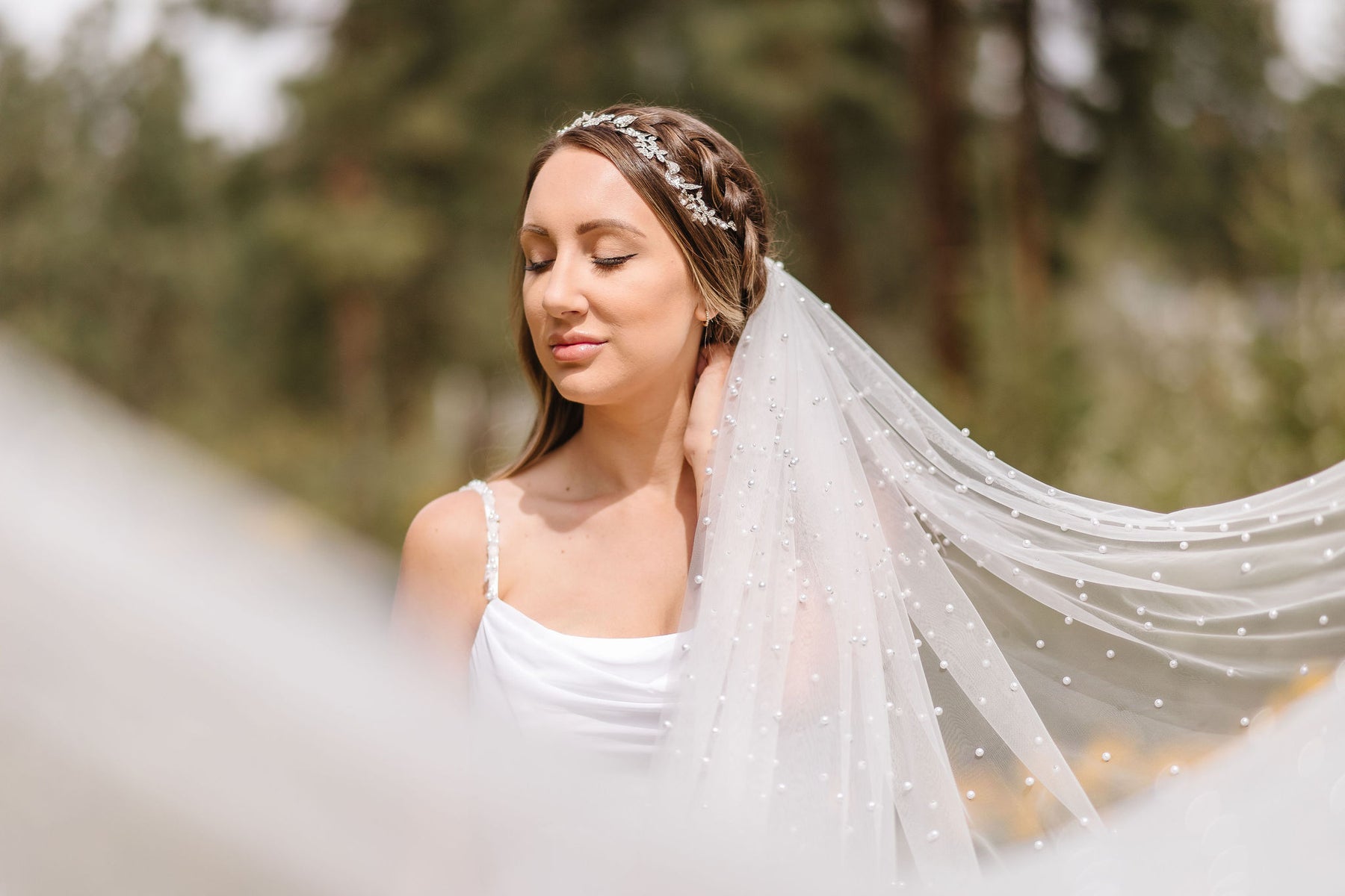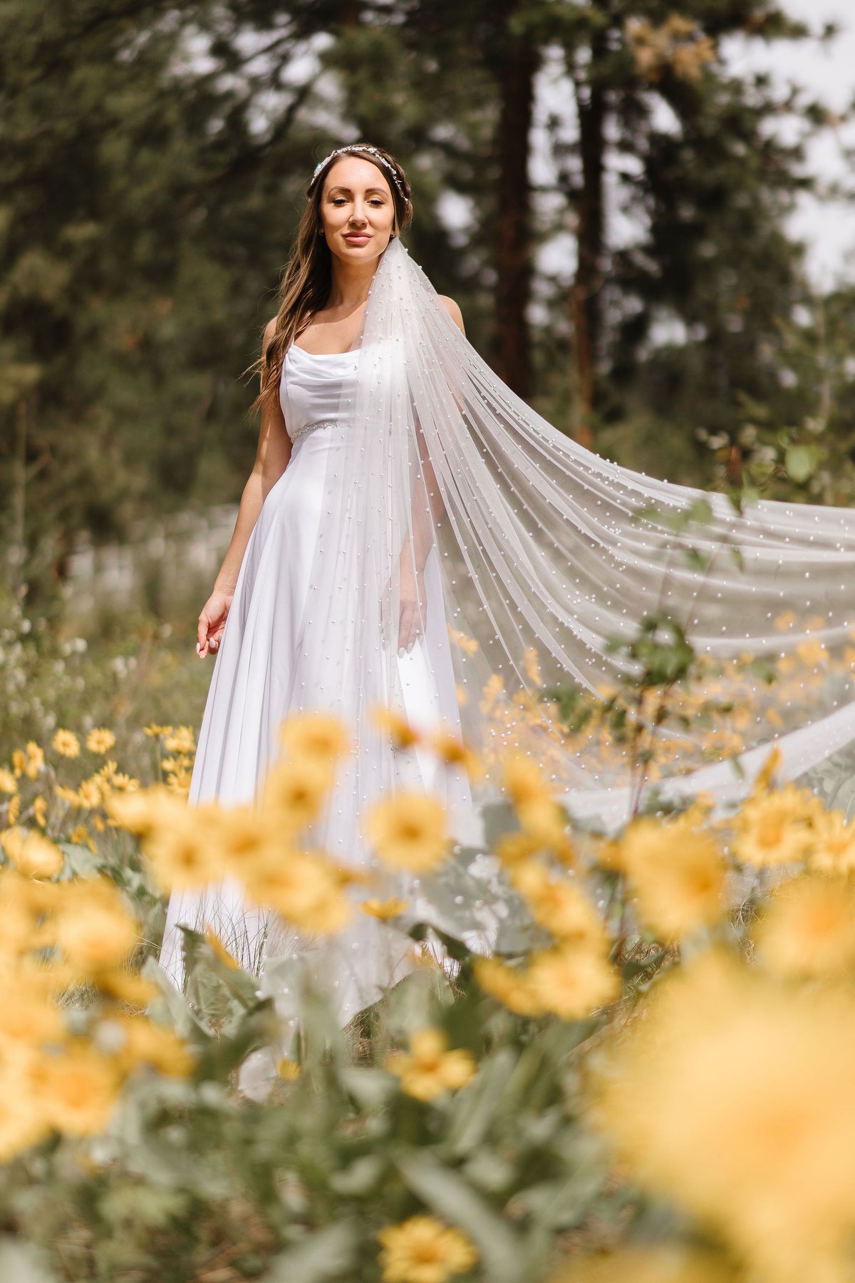 Introducing the NEW ESTELLE Pearl Veil — a stunning blend of classic elegance and modern flair. This exquisite veil features an array of pearls in various sizes, beautifully incorporated throughout its design. It has a rounded bottom and is gathered at the top, hand-sewn onto a 3-inch metal hair comb. The veil pairs perfectly with many of the new dress styles for the upcoming season. Romantic and chic, it is an ideal choice for any bride.