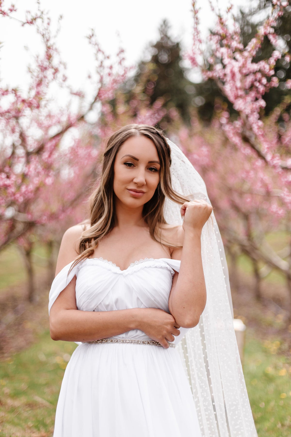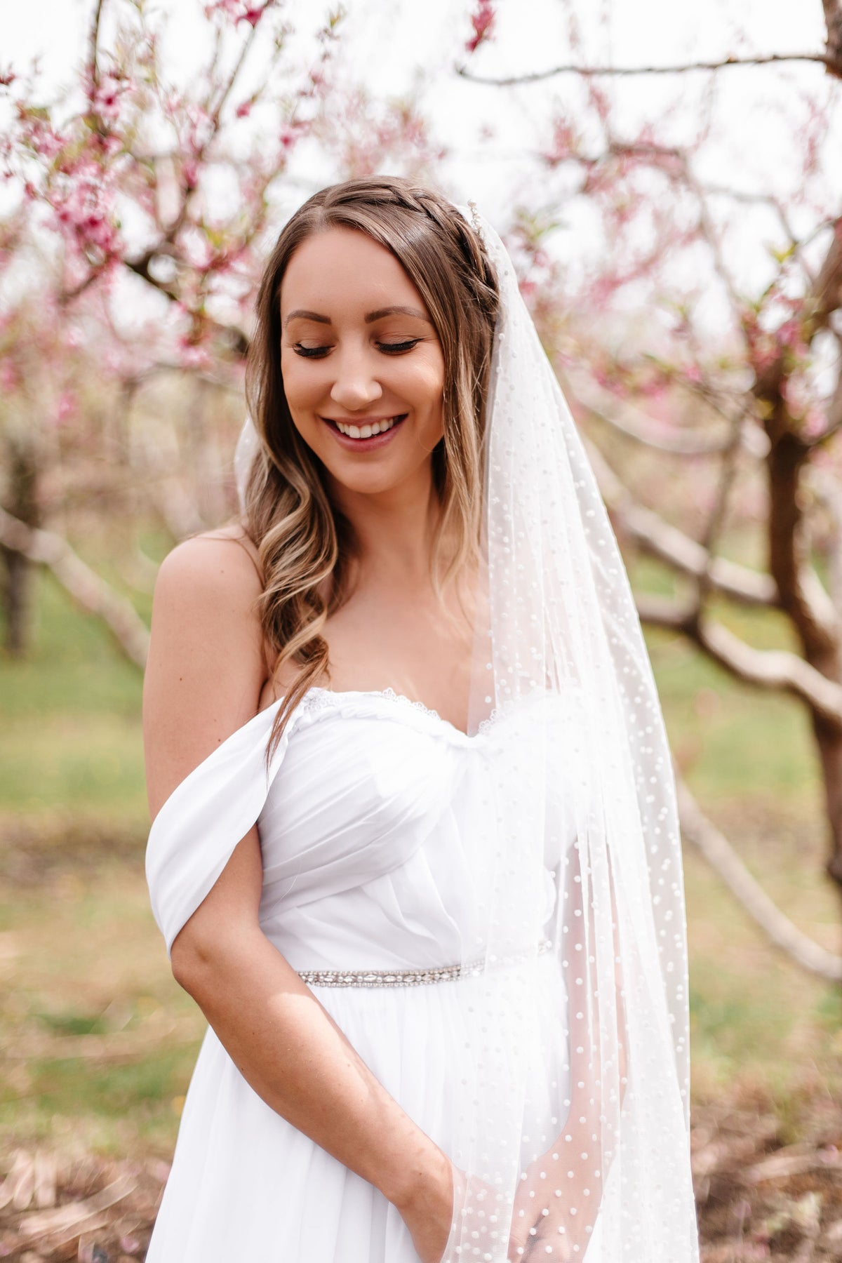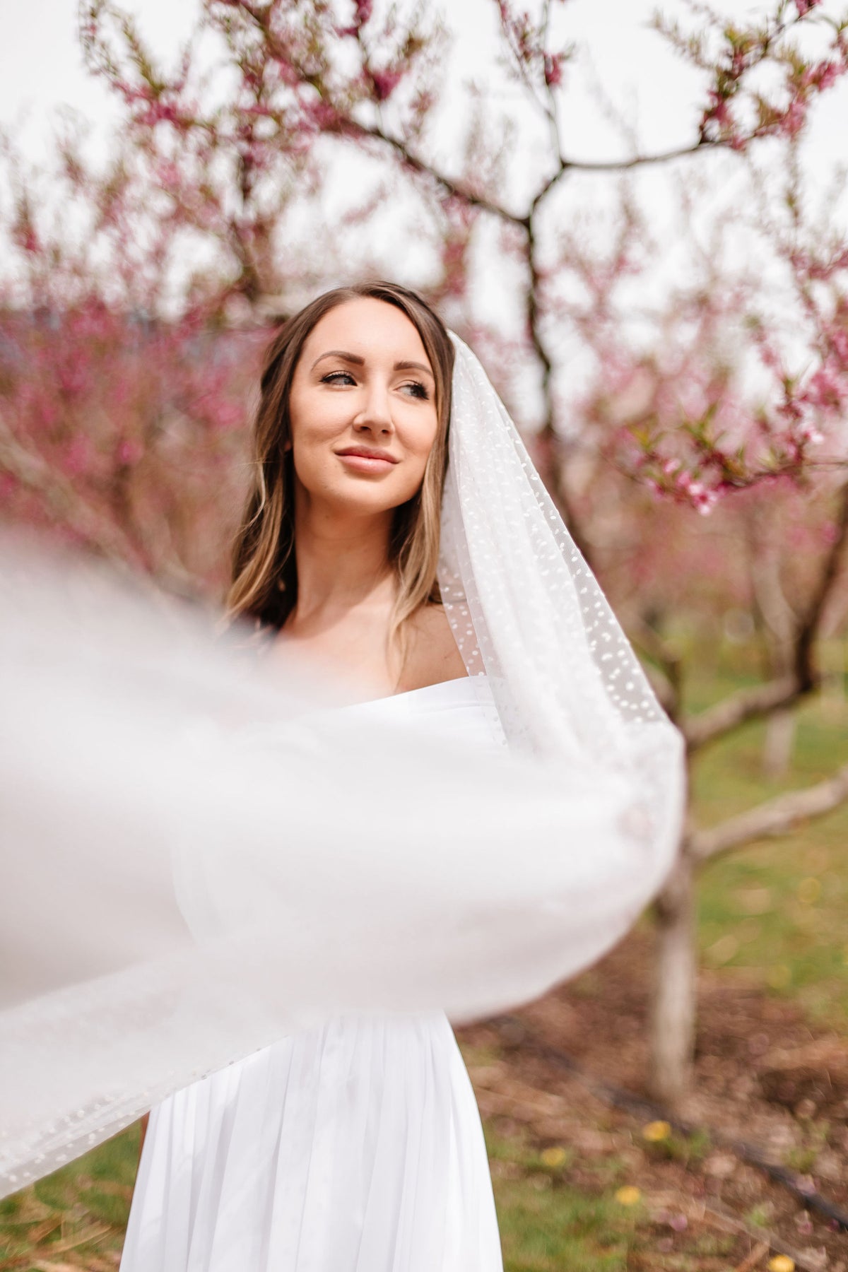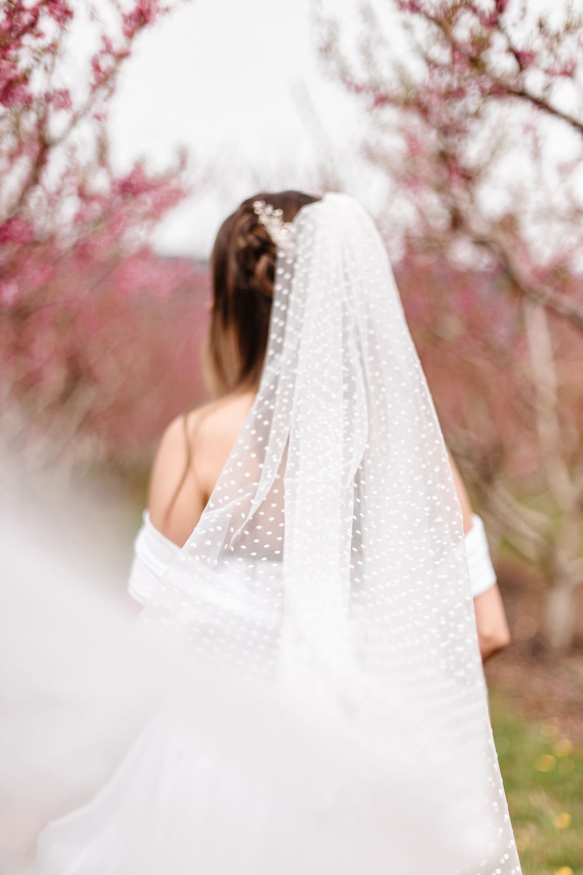 The MADELEINE Veil is super fun and unique.... it's perfect for the non-traditional bride! It features velvet polka-dots through out the beautiful soft tulle. This veil is gathered evenly and handsewn onto a metal hair comb. Xoxo Couture's tulle veils are top quality, handmade, beautifully rounded and shaped, and Made with the best north American tulle, this veil is the perfect touch to finish off your wedding day look!