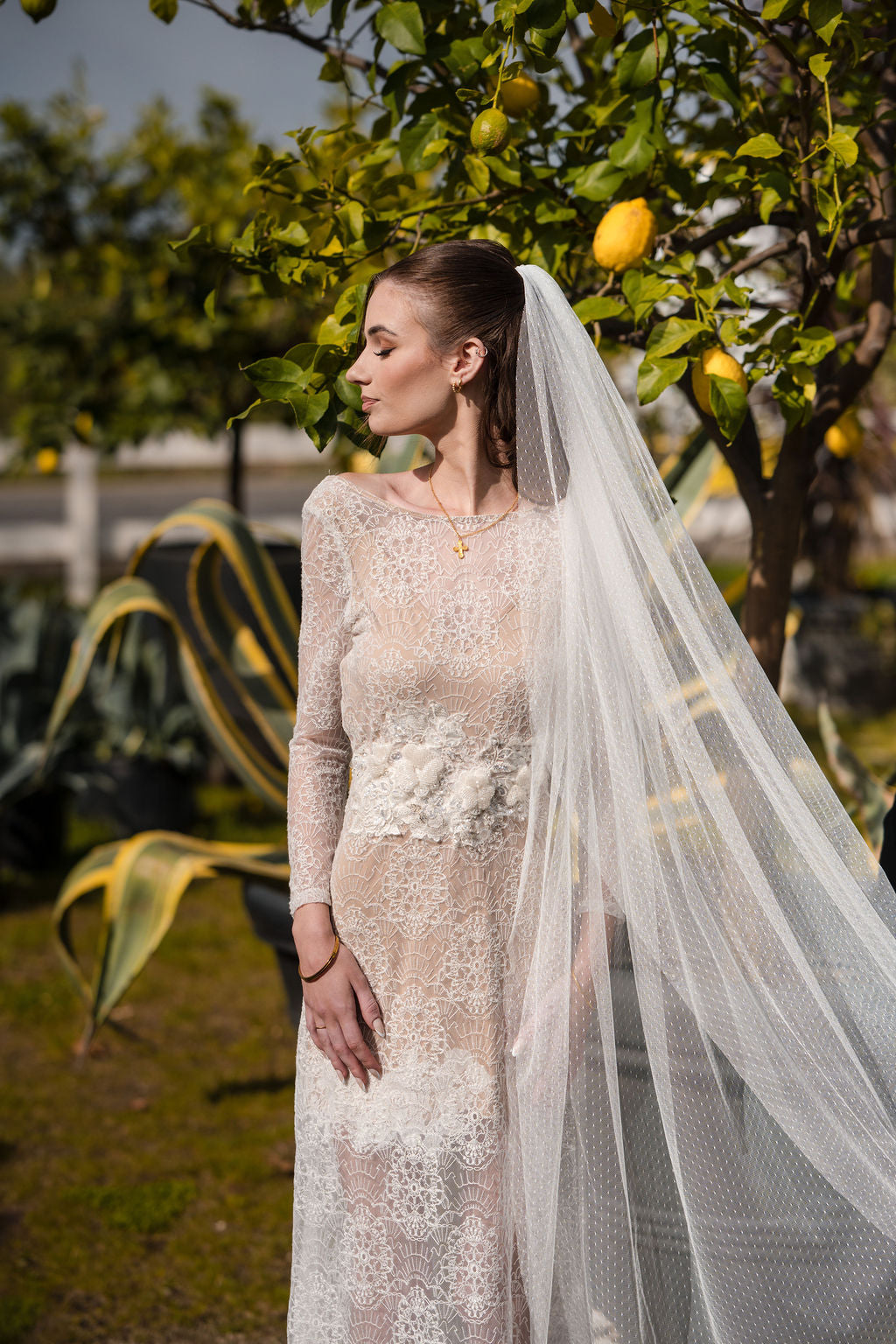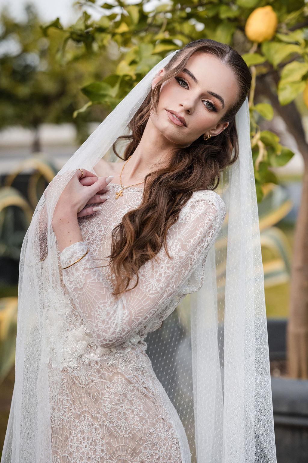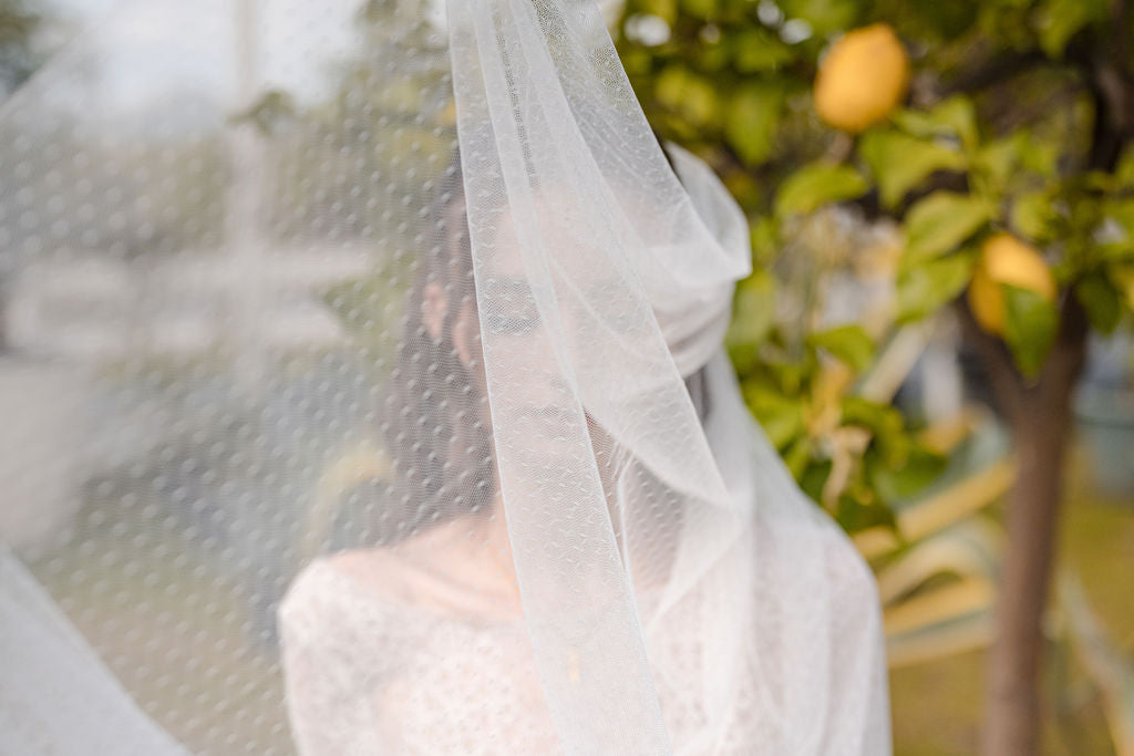 Our LINNEA delicate swiss dot veil is perfect for the non-traditional bride! It features small delicate dots through out the beautiful soft tulle. This veil is gathered evenly and handsewn onto a small metal hair comb. The cut of this veil is stunning with a rounded bottom and a tapered top, giving this veil a smooth, less voluminous look. Xoxo Couture's veils are top quality, handmade, beautifully rounded and shaped, and made with the best materials available. This unique veil is the perfect touch to finish off your wedding day look!