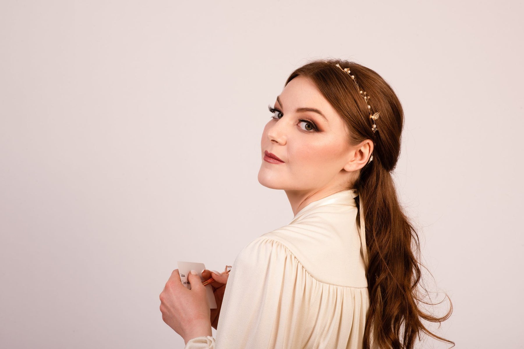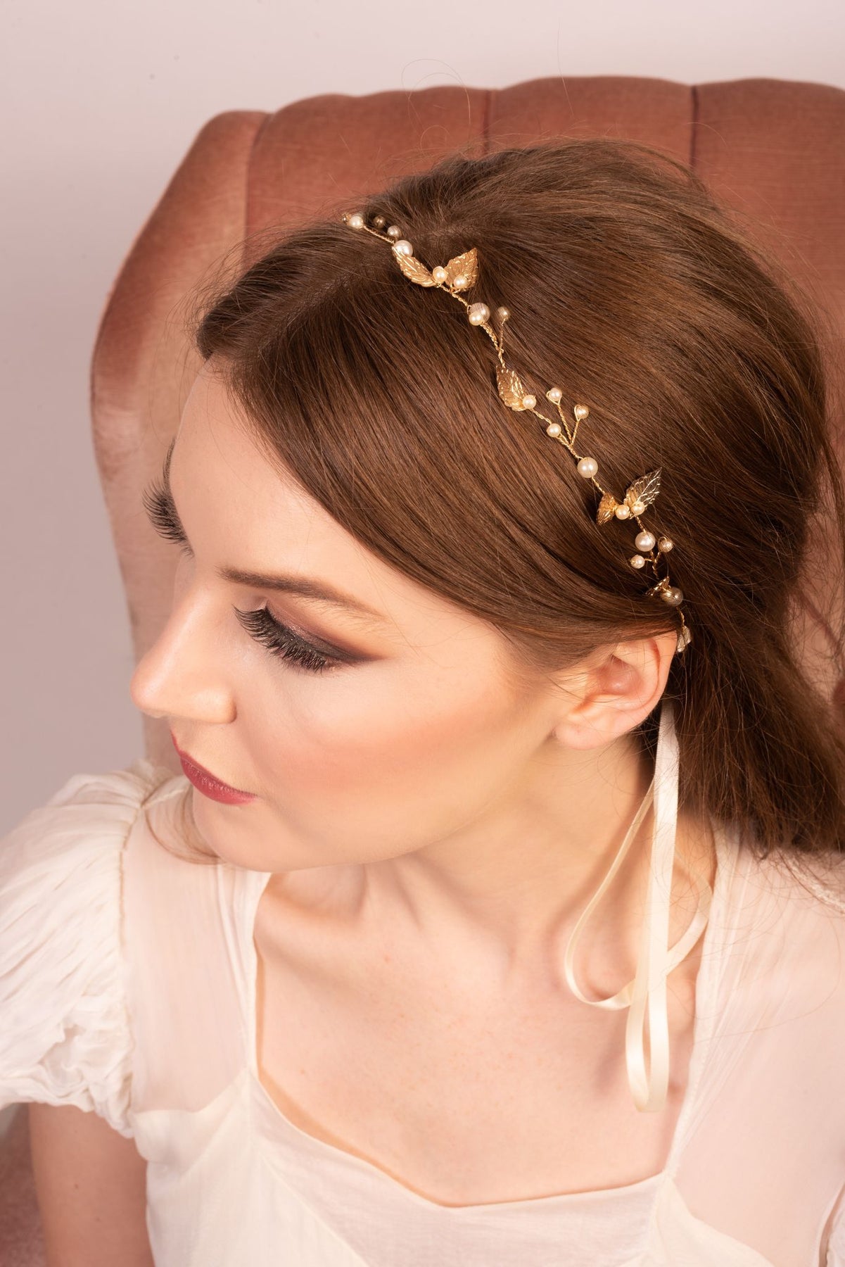 This dainty AVA hair vine is a popular addition to our 2022 collection. Its subtle and beautiful design make it the perfect accessory for a whimsy wedding! Featuring small metal leaves finished with pearl centers, this design is a gentle touch to a whimsy gown. Available in 3 colors and multiple length. Choose from a 16" halo style vine or a 43" long vine, used to weave into a braid.