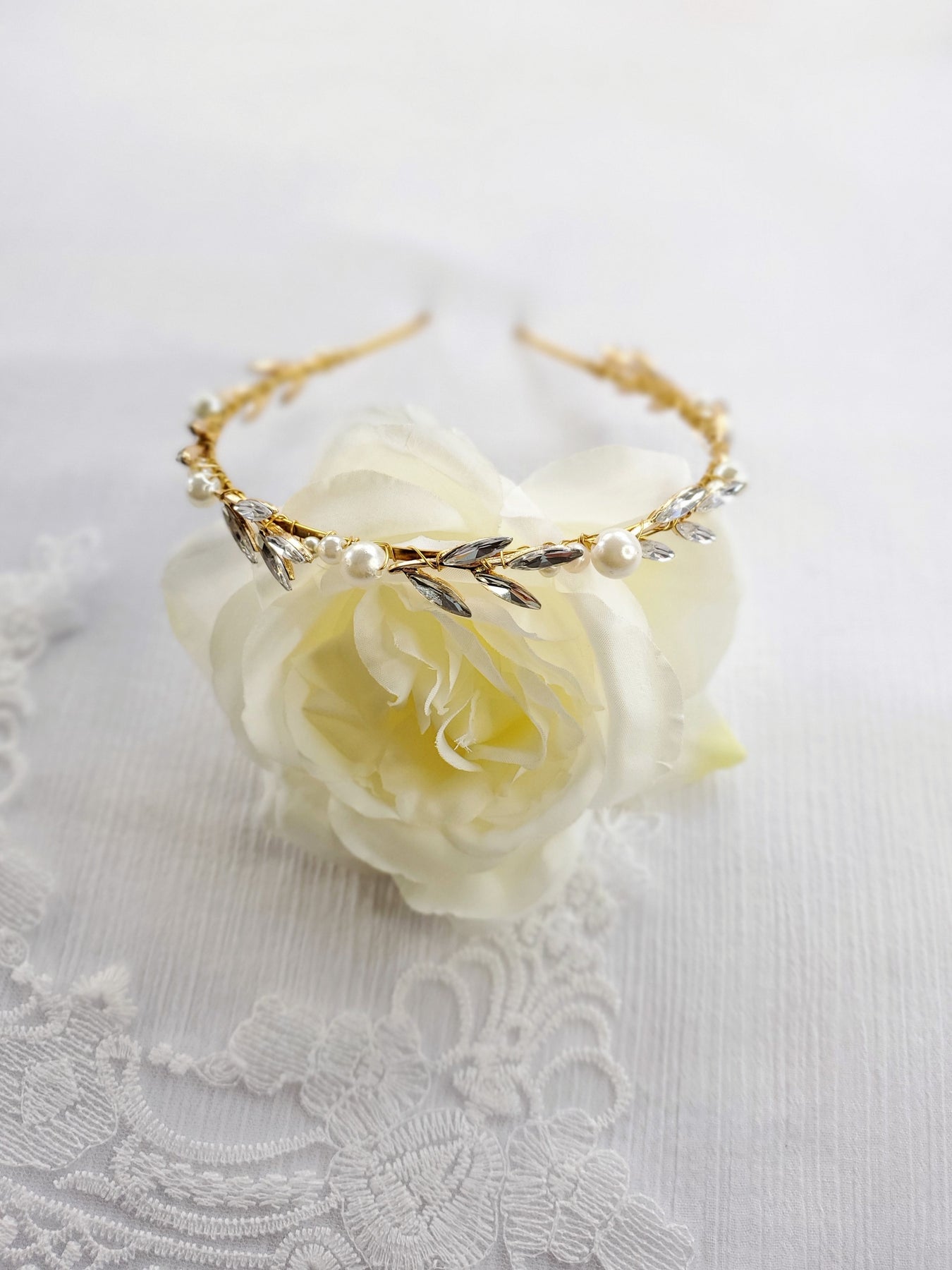 REIN | Gold, Crystal & Pearl Headband | Dainty Halo | Gold Crown